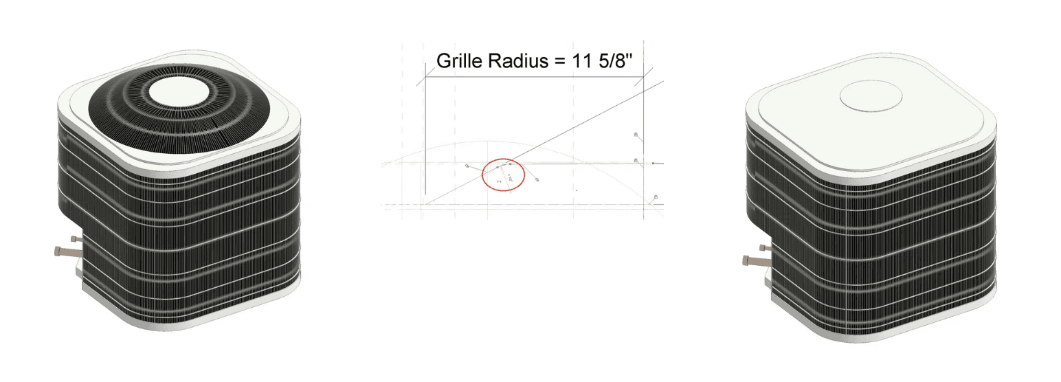 Here’s an example of a condenser unit with a fan at the top created as a revolve. The model worked fine for some sizes but on other types the family broke and Revit deleted the fan geometry to resolve the issue. It was only when we constrained the arc radius, circled in red, that the revolve worked properly for all types.