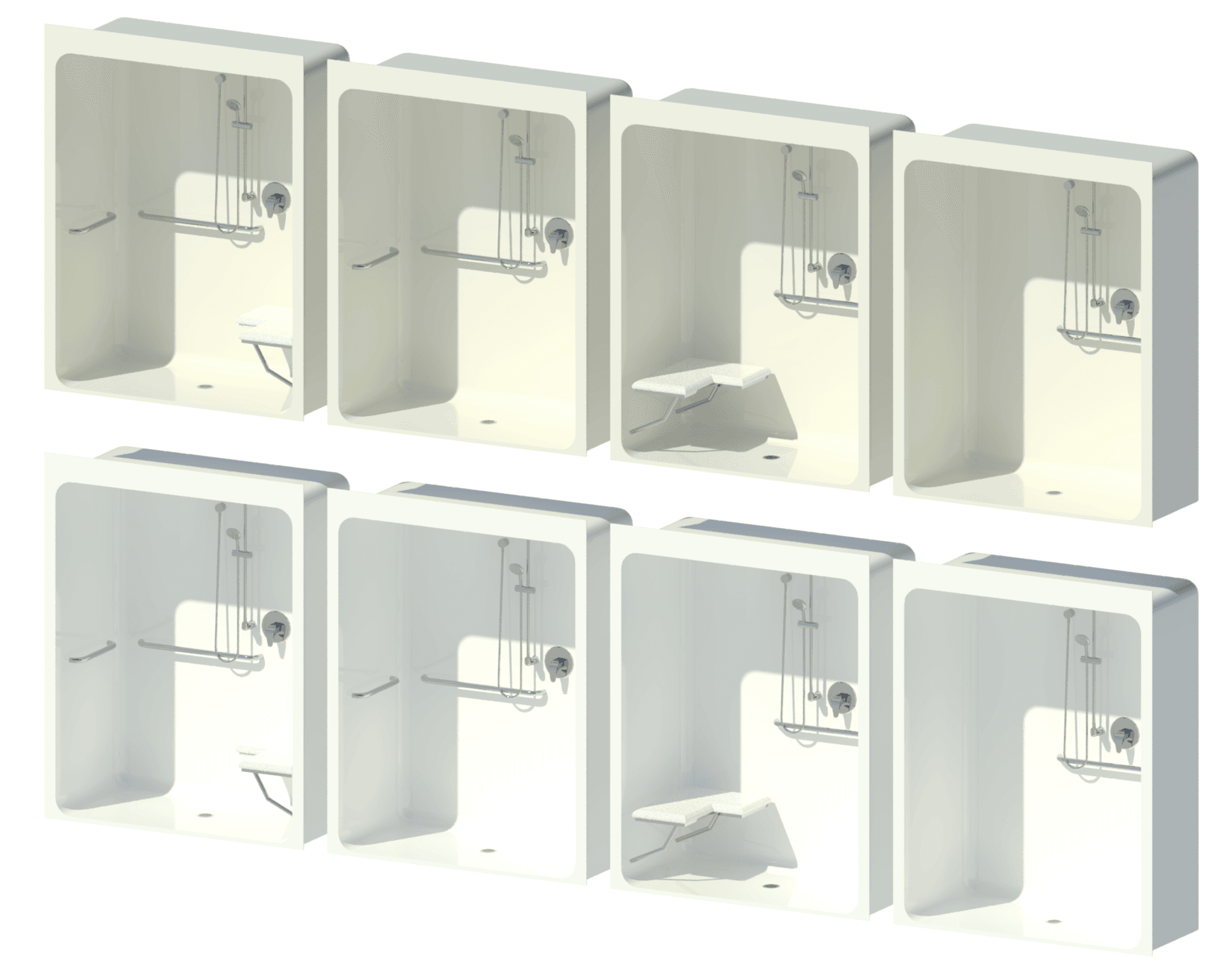 This collection features six families from the manufacturer Aquatic Bath and three families from Maax. The families cover a range of different sizes, materials and uses, ranging from standing showers to roll-in showers that enable people to enter on a shower wheelchair. They are all one-piece alcove models made from acrylic.