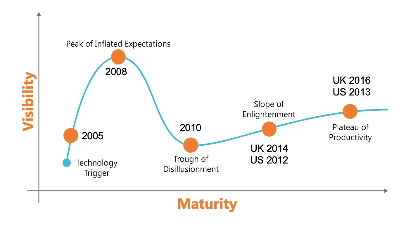 Visibility vs. Maturity of BIM Technology in AEC Industry. ©Gartner Hype Curve & @Cogital data.