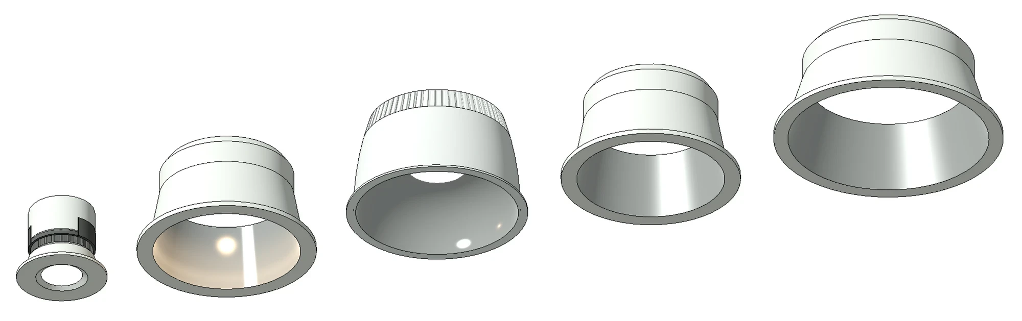 These Revit families utilise three levels of details to offer optimum performance at all stages of building development. Especially for the downlights, we have tried to make the most of materials to show the intricate body as opposed to showing these fins with geometry. This helps to keep file size to a minimum.