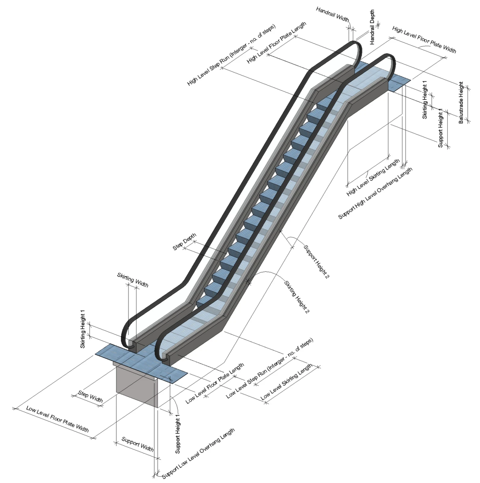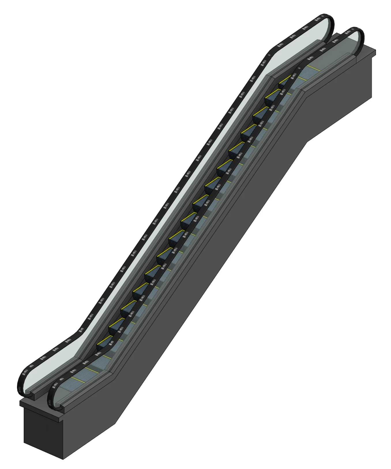 3D view of escalator Revit family showing parametric functionality.
