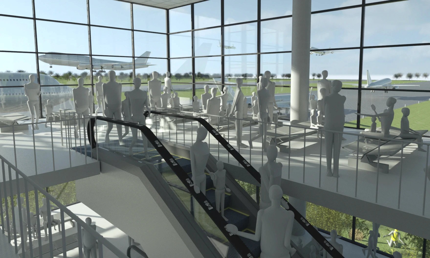 Rendering showing escalator and Andy in airport scene.