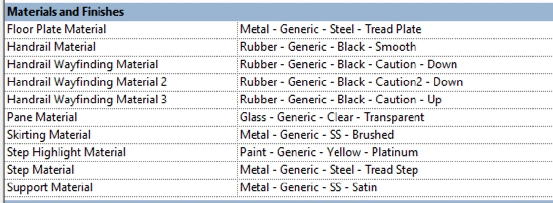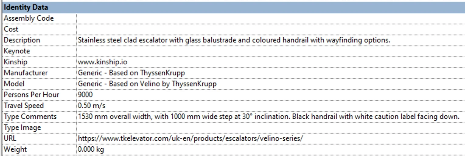 In addition, as a fully flexible Revit family, it can be easily modified to create custom types as needed. Ten material parameters control the makeup of each element, from structure to handrail. Other than the various parameters shown below for construction options and length, we've also added some data that should prove useful in a project, such as travel speed and persons per hour.