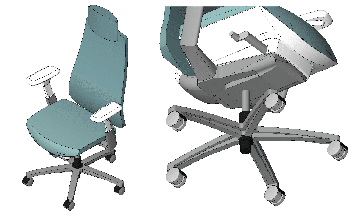 Below, we have two furniture families sourced from manufacturers. In both cases, there is an excessive amount of detail (and therefore time) that has gone into the base of the chairs. These details would be hidden in plan view and most 3D views, and will only show up in section or elevations. This detail and time would have been better spent on improving the geometry for the seat, backrest and armrest.