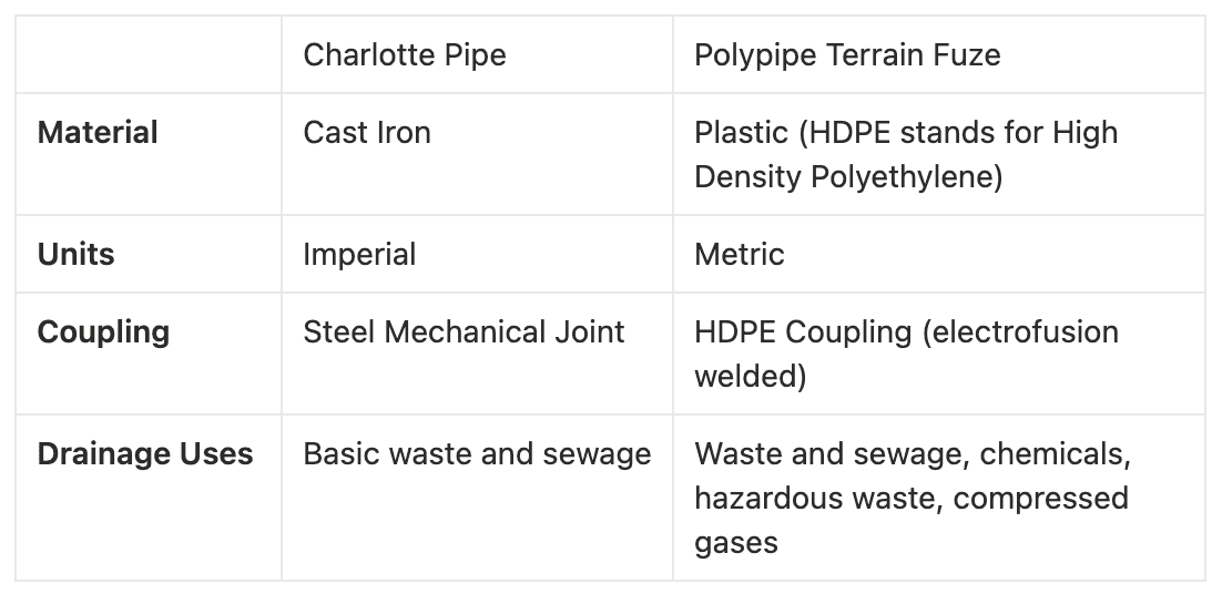 While both this collection and the previous Charlotte Pipe collection feature piping content for drainage systems, there are some key differences between the Charlotte no-hub pipe and the Polypipe Terrain Fuze: