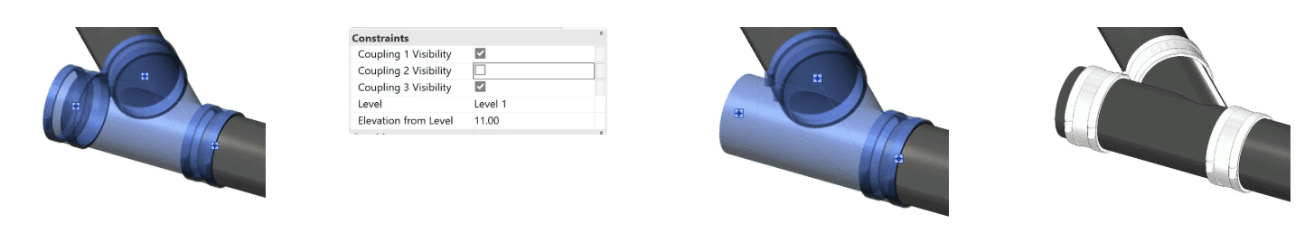 The couplings can be turned off manually, allowing coordination of fitting-to-fitting with a shared coupling. In the images below, we can see a selected wye fitting, which can then have its coupling turned off. This allows the end cap to have a shared coupling. So, there will be no duplicated coupling and no need for a small section of pipe between wye and end cap.