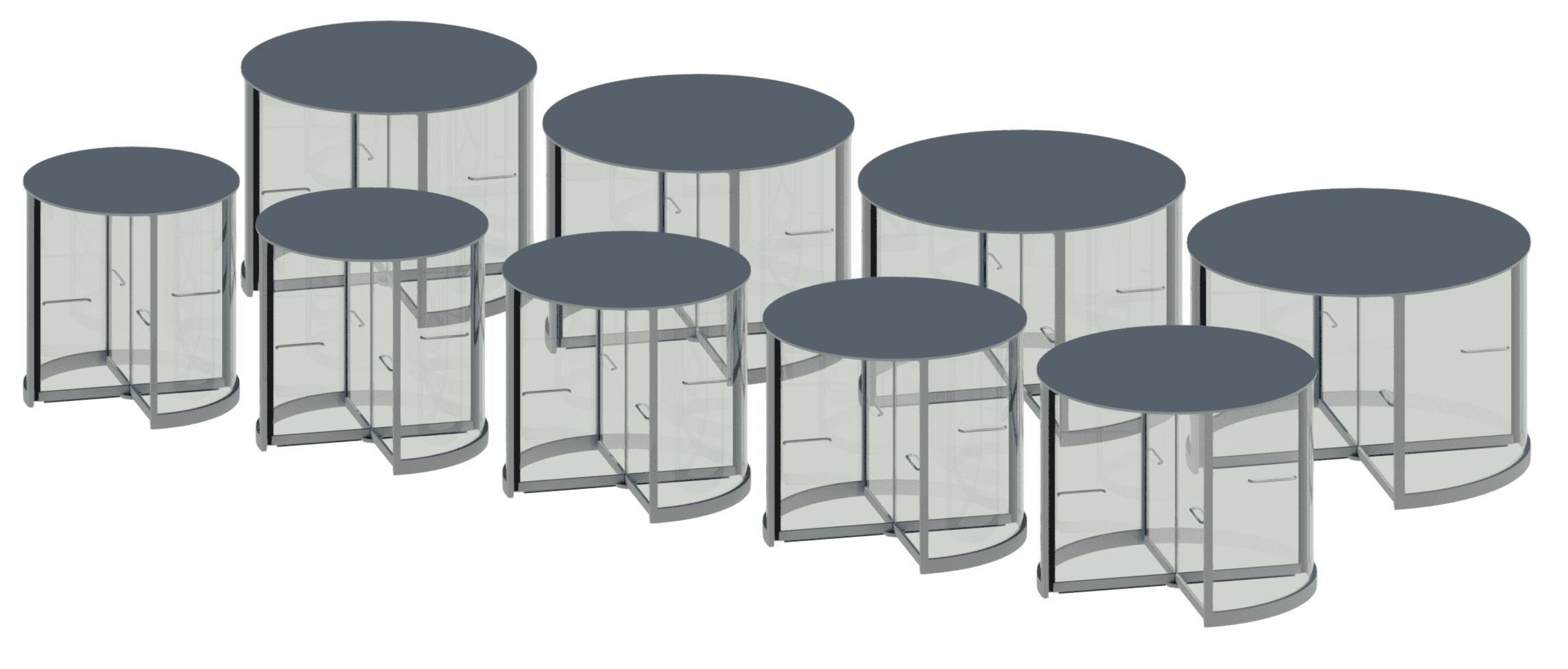 From manufacturer IRD (International Revolving Door) we have two families covering the three-wing and four-wing Comet manual door range. Both families have over 40 types driven by a type catalog. The types are defined by the standard internal door diameters and material options available from the manufacturer.