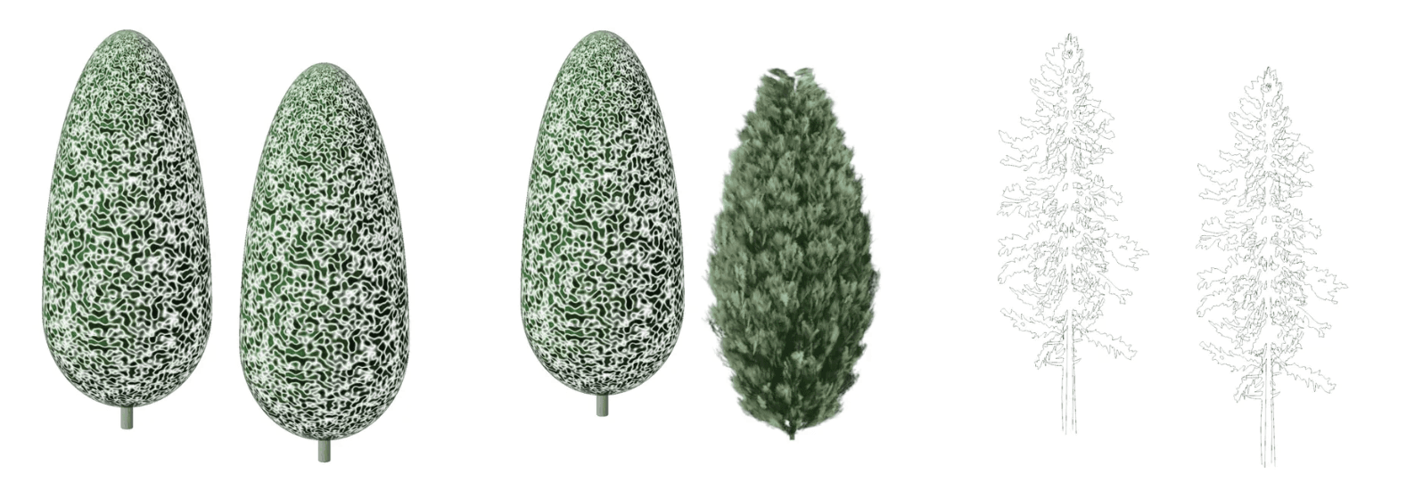 Thanks to the input from Fiorella, we’ve made two versions of the Revit families in this collection. One version contains the RPC model which delivers photo-realistic rendering in Revit. The second version is intended for landscape architects working on project design. Landscape architects do not typically use Revit for any rendering. Instead, they use programs such as Lumion which far exceed Revit's capability for planting visualization. This means that they do not need the RCP seen in the medium level of detail.