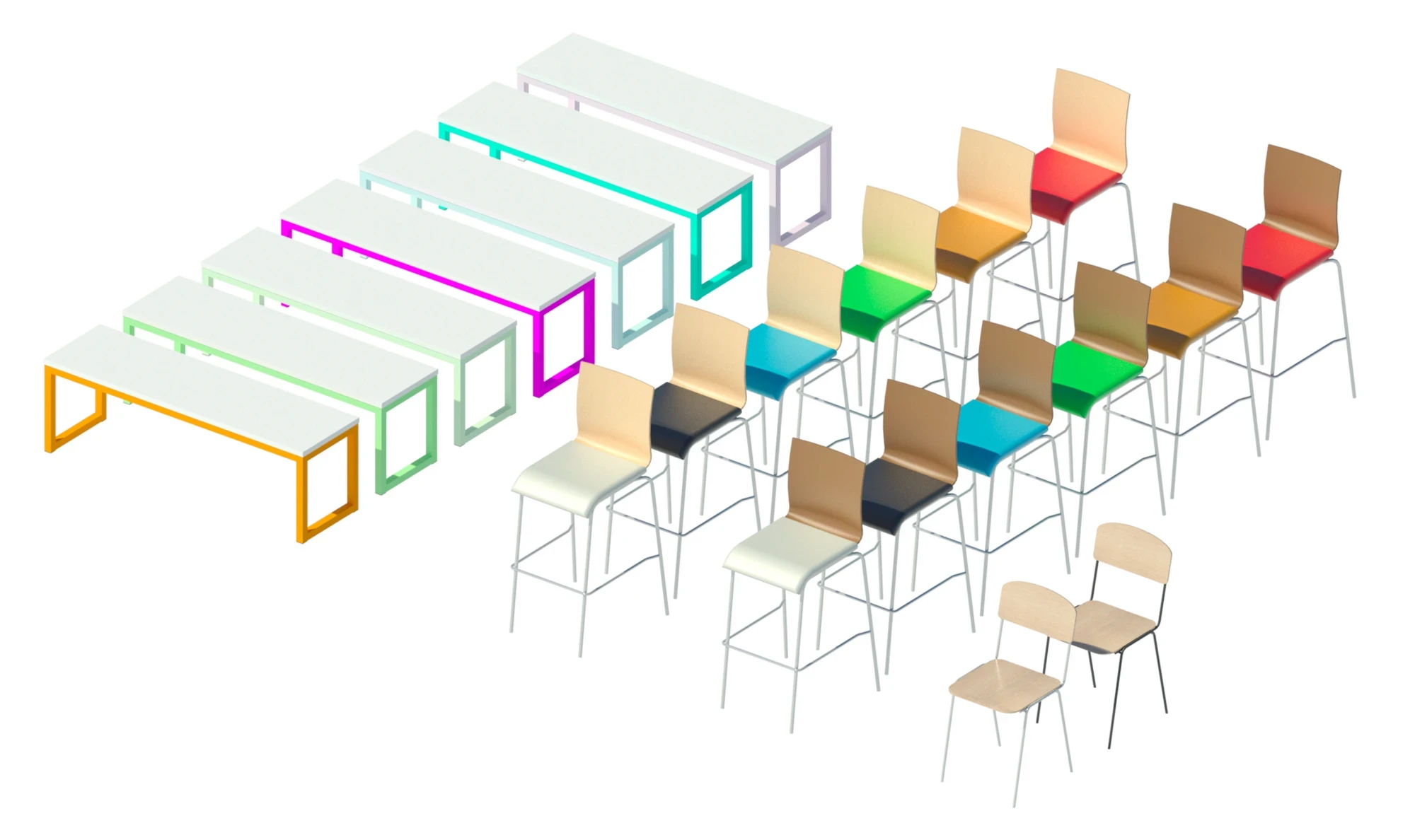 The collection contains a variety of seating families to cater for most cafeteria and school dining scenarios. These include two chairs, a bench and a stool from manufacturers AJ ProductsOffice Furniture OnlineFurniture At Work and Direct2U.