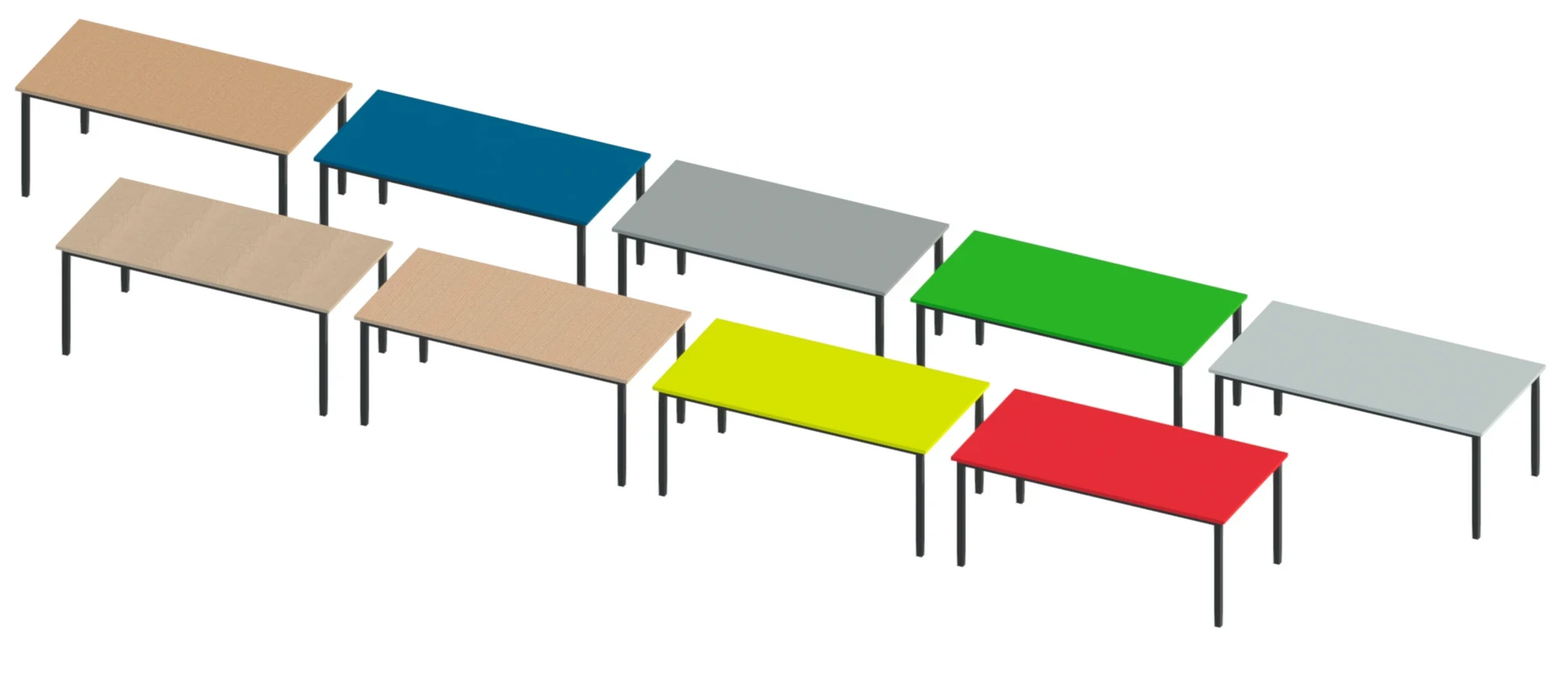 The collection contains teacher desks and rectangular student tables from Office Furniture Online and trapezoidal student tables from UK Educational Furniture. All of the Revit families have a large number of types covering variations on size, frame and table finish, but the trapezoidal student table in particular has more than 2,000. In order to make it manageable, we've split it into six families by height, leaving around 400 types within each.