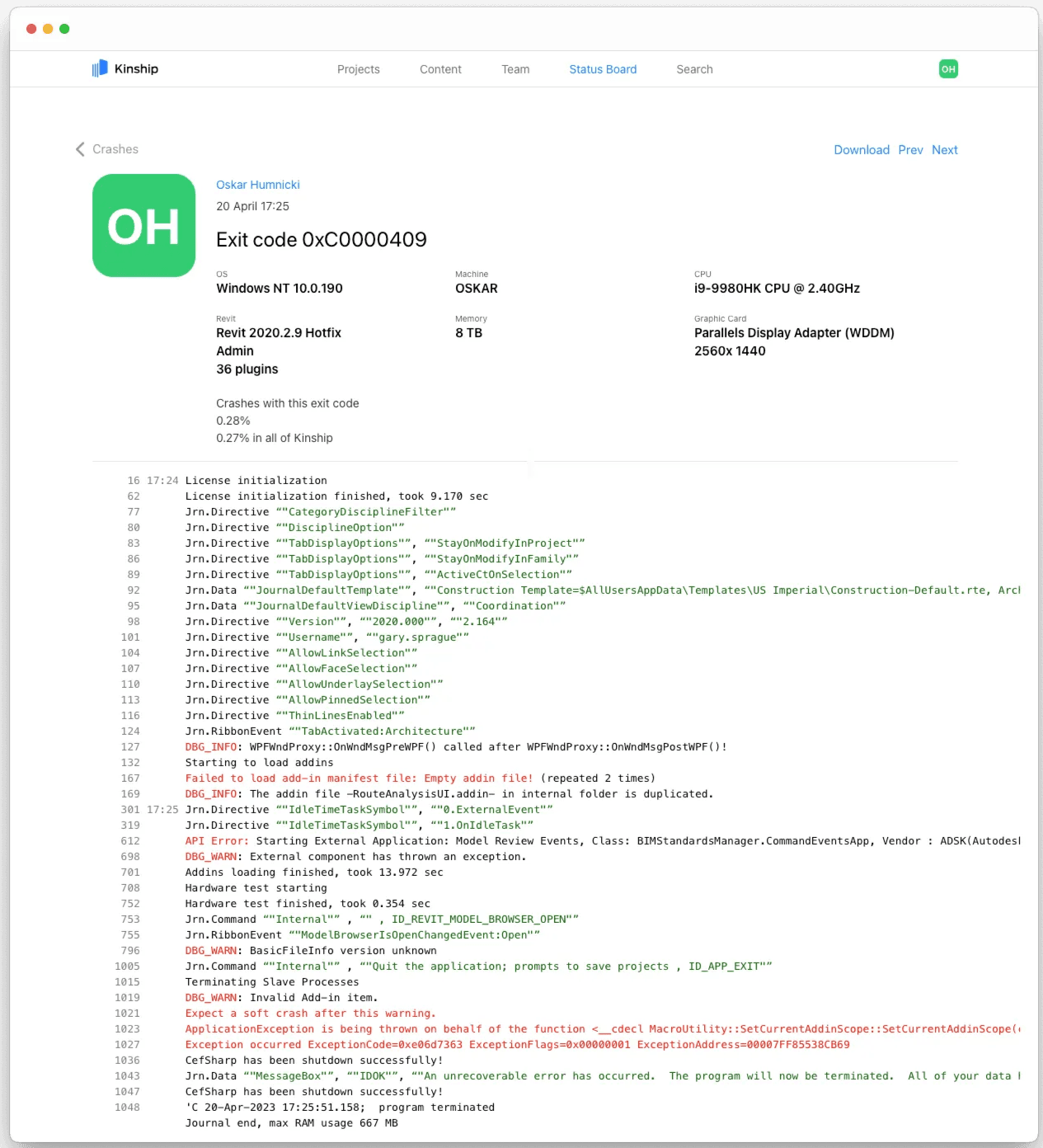Within an individual crash report, you can see a summary of the user’s session length, exit code, Revit version and active model. You can also investigate the user’s device setup in depth, with access to detailed hardware specs and a full list of installed Revit plugins.
