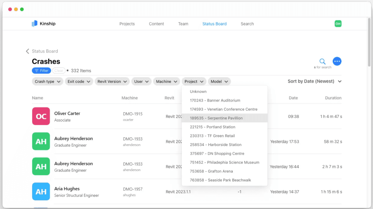 Kinship captures details on Revit crashes as they happen and provides you with a detailed report on all crashes that your team experiences. You can filter crashes by severity, user, Revit version, project and model to get a clearer picture of the extent and impact of crashes.