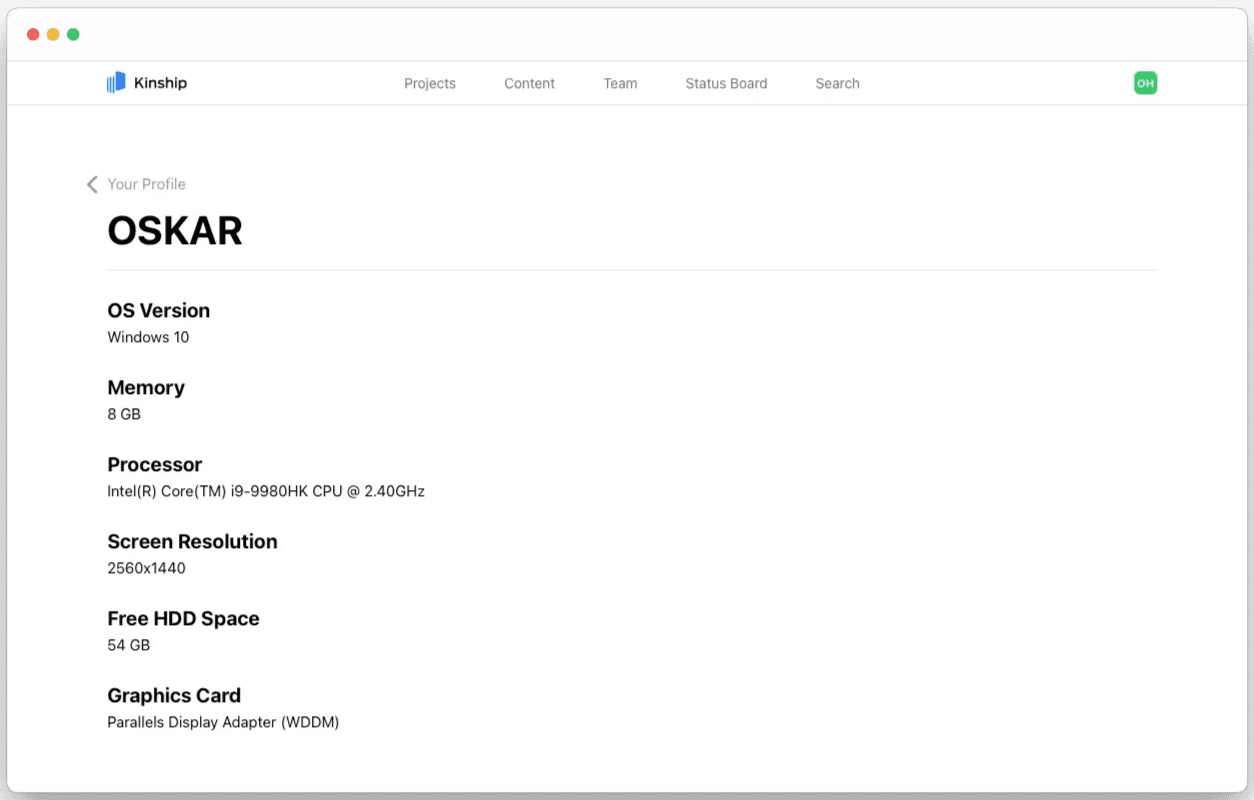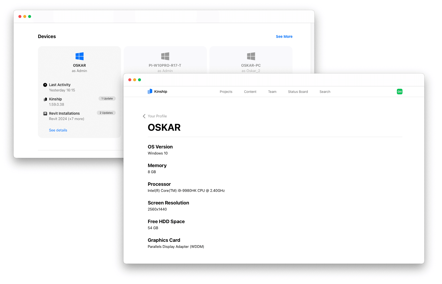 Your company’s IT department may implement policies or guidelines on the hardware specifications for devices running Revit. IT may also be responsible for monitoring which versions of Revit people have installed and rolling out upgrades. Kinship gives you easy access to users’ machine specs, which can save a lot of time in identifying team members who are using outdated devices or versions of Revit.