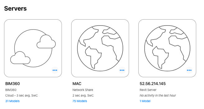 Many teams working in Revit use multiple hosting environments for models, depending on project requirements. If your team notices a particular model is slow to sync, where it's hosted can make a difference. In Kinship you can filter models by server to see recent activity and get a breakdown of each server’s average sync time over the previous hour.
