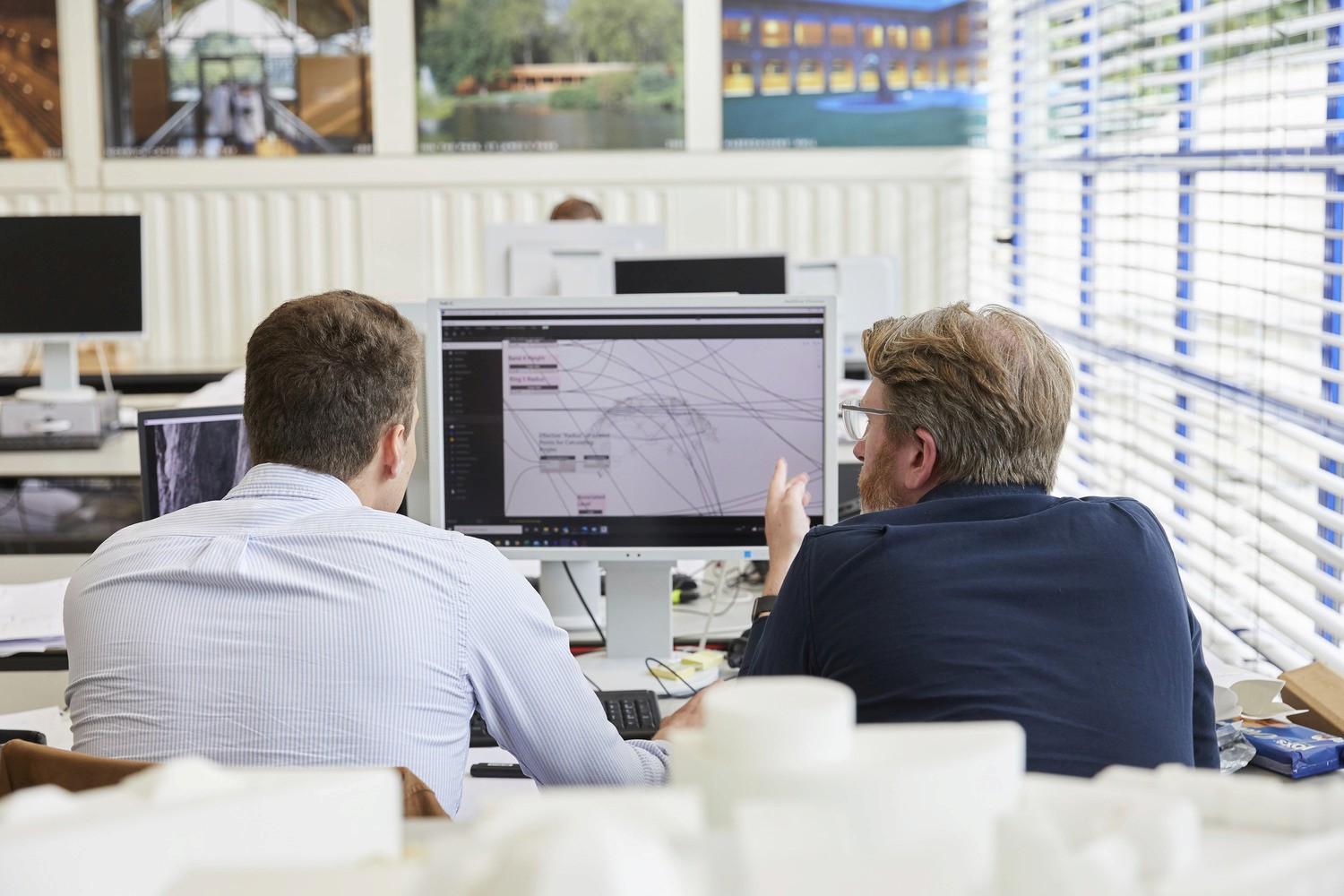Corrie and a colleague working on a parametric model in the Hopkins Architects office.