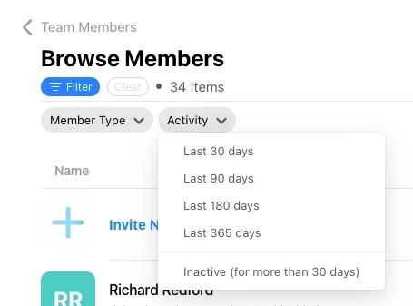 We've improved activity filters in team member listings so you can filter for users that have been active within the last 30, 90, 180 or 360 days. You can also filter to see which users have been inactive for over 30 days.