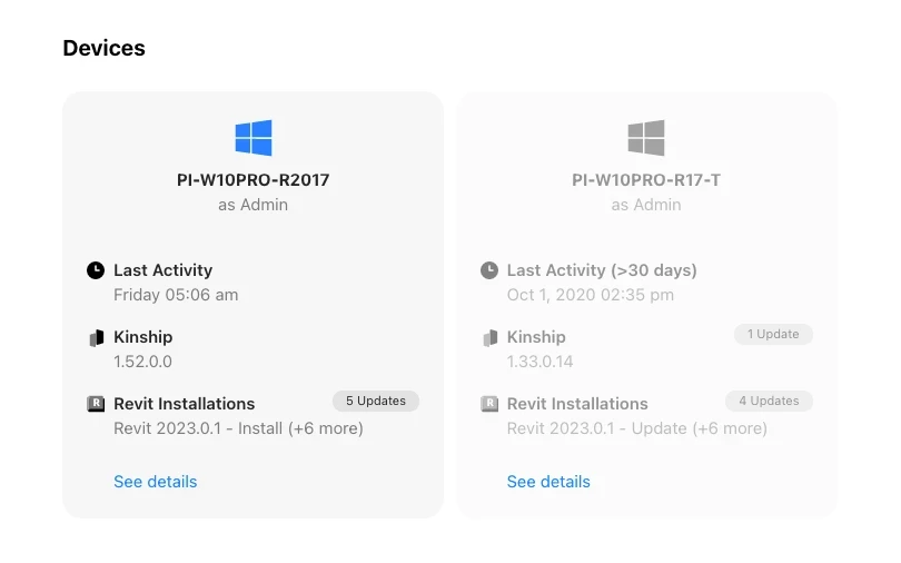 We've launched an updated Devices section on users' profiles and preferences pages to make it quicker and easier to see which devices need updating with the latest versions of Revit or Kinship.