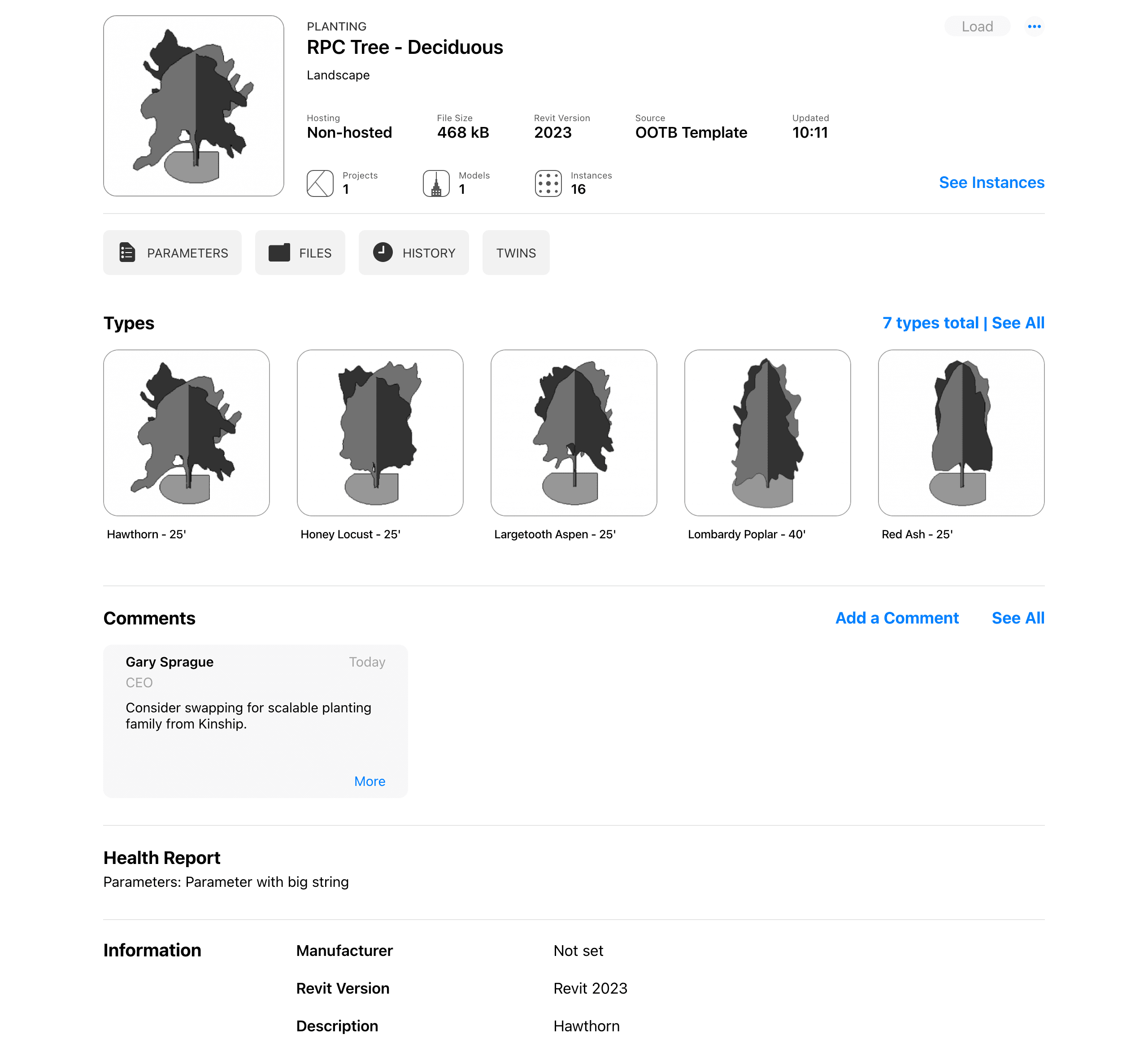 And clicking on any family in a model or project will reveal the same detailed information that’s available for families in the library and collections. You can see all of a family’s parameter data, instances or quantities, history, types, identity information, health warnings and comments. You can even add a custom searchable description to the family.