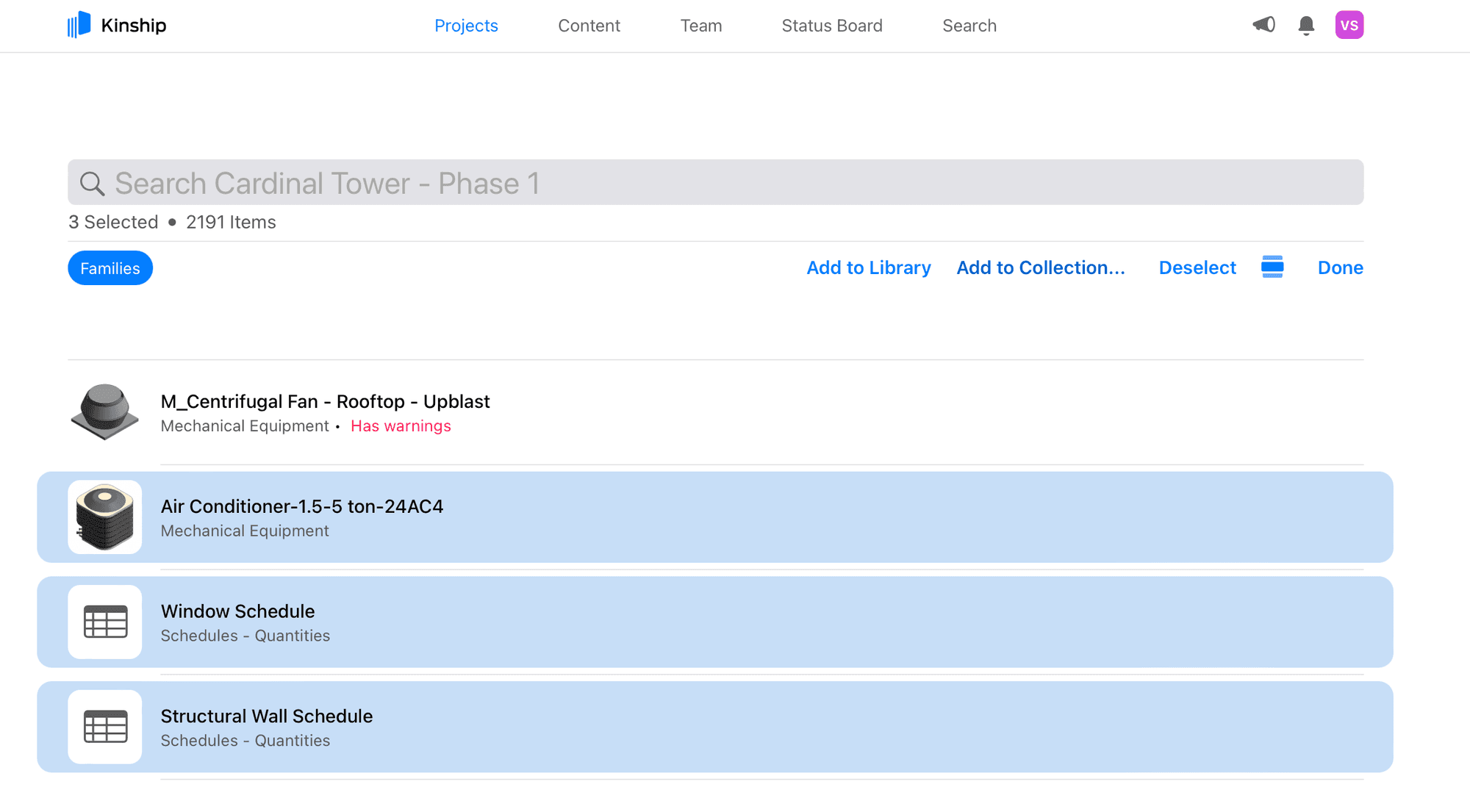 The families page within models and projects now offers similar functionality to family listings in the library and collections. You can filter, sort, select, search and view project content just like any other content you’re managing in Kinship.