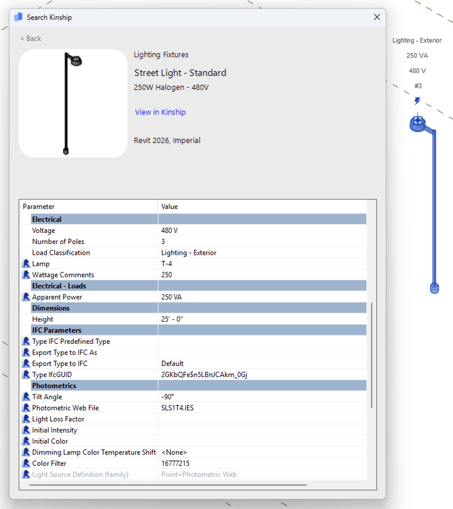 Now when you call the Kinship search in Revit with an element already selected in your model, Kinship immediately displays the full details for that item.