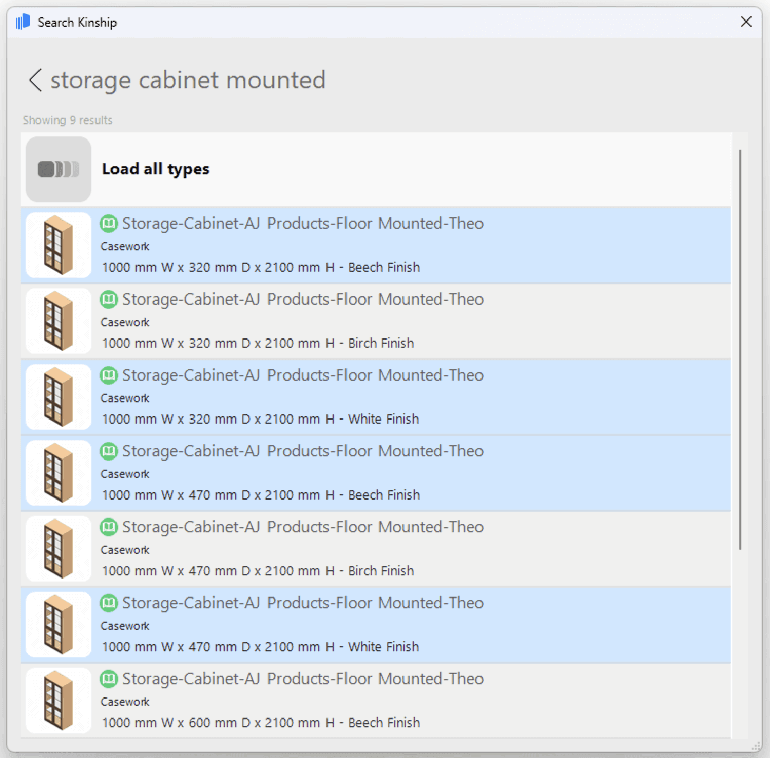 When loading content from the Kinship web app, previously you could only load an entire family or families. Now you can also load individual family types straight from the web app into Revit.