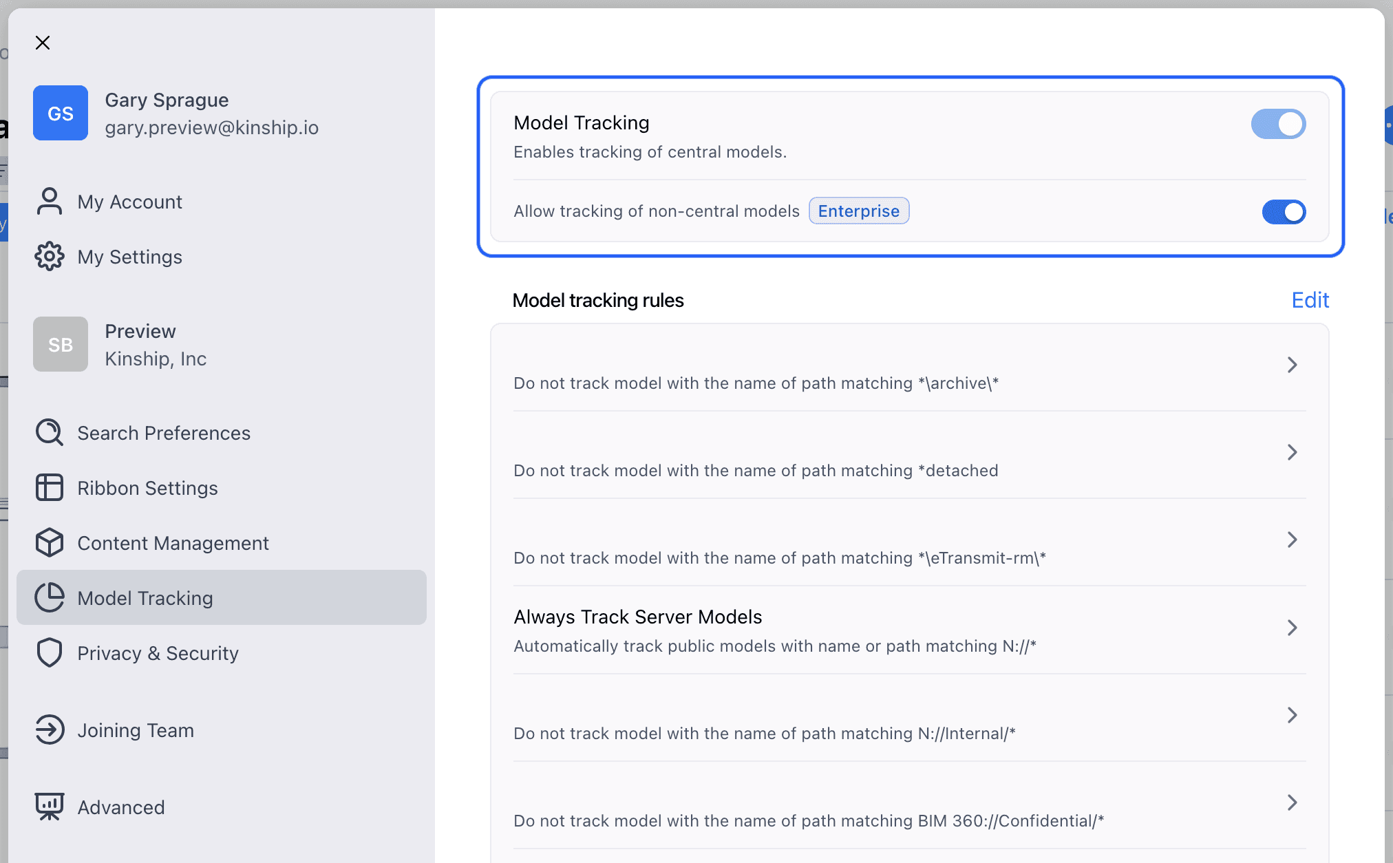 Just like with central models, you add local models directly from Revit using the Model Sync Status button, or administrators can create rules to control which local models will be added or ignored. Updates for local models get synced to Kinship after each save in Revit.